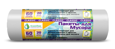 Мешки для мусора 60 л, 7 мкм, в рулоне 20 штук, белые, 60х70 см, GreenClean